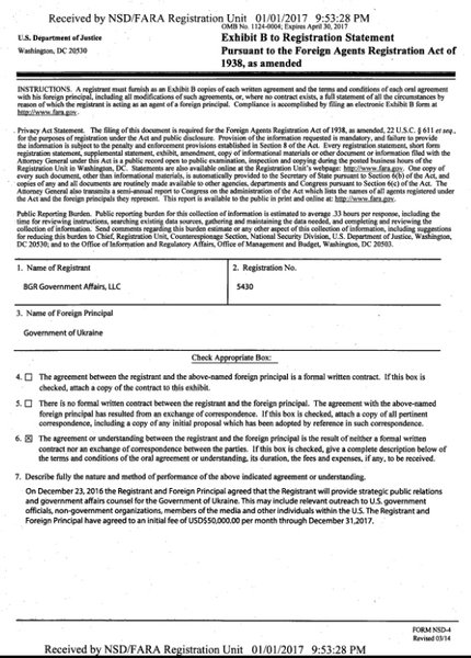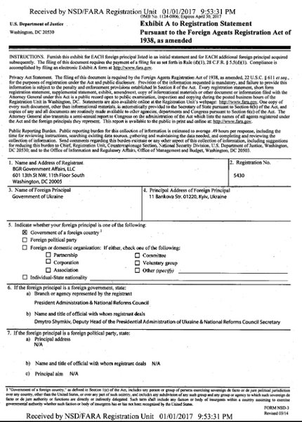 BGR Group подала соответствующую информацию в FARA 1 января 2017 года. Адрес клиента в представленной информации - "Банковая, 11, Киев, Украина". Цель деятельности компании - "усиление связей между США и Украиной и поощрение американских частных предпринимателей инвестировать в Украину".