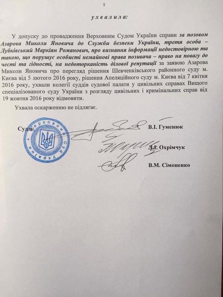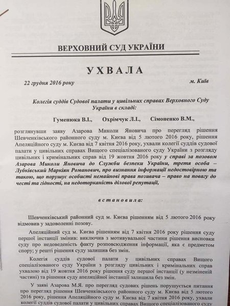 Окончательное решение по этому делу 22 декабря 2016 года приняла коллегия судей Верховного суда Украины, отказав Азарову в допуске к производству по всем его искам и заявлениям о пересмотре принятых судами решений.