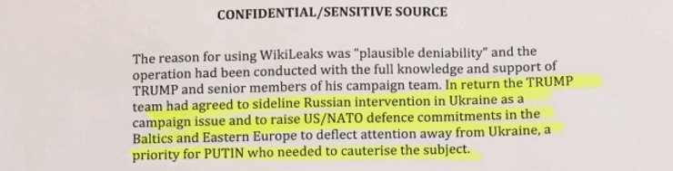 "В обмен команда Трампа согласилась отстраниться от российского вторжения в Украину, как части кампании, и заняться оборонительными обязанностями США-НАТО в Балтии и Восточной Европе, чтобы отвлечь внимание от Украины, приоритетной для Путина, тема которой должна быть вытравлена", - говорится в "компромате".