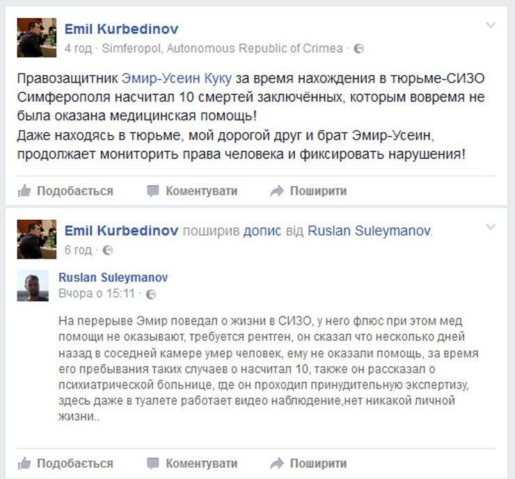 Адвокат также разместил на своей странице пост, в котором говорится, что сам Эмир-Усеин Куку нуждается в медицинской помощи. "Эмир поведал о жизни в СИЗО. У него флюс, при этом медпомощи не оказывают, требуется рентген. Также он рассказал о психиатрической больнице, где он проходил принудительную экспертизу. Здесь даже в туалете работает видеонаблюдение", - говорится в сообщении.