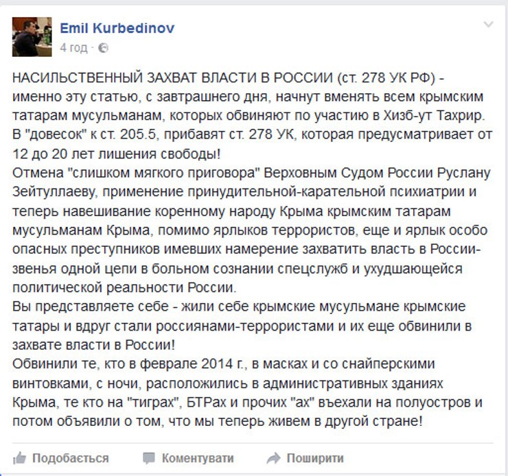 "Насильственный захват власти в России" (ст. 278 УК РФ) - именно эту статью с завтрашнего дня начнут вменять всем крымским татарам - мусульманам, которых обвиняют по участию в "Хизб-ут Тахрир". В "довесок" к ст. 205.5, прибавят ст. 278 УК, которая предусматривает от 12 до 20 лет лишения свободы!", - написал адвокат.