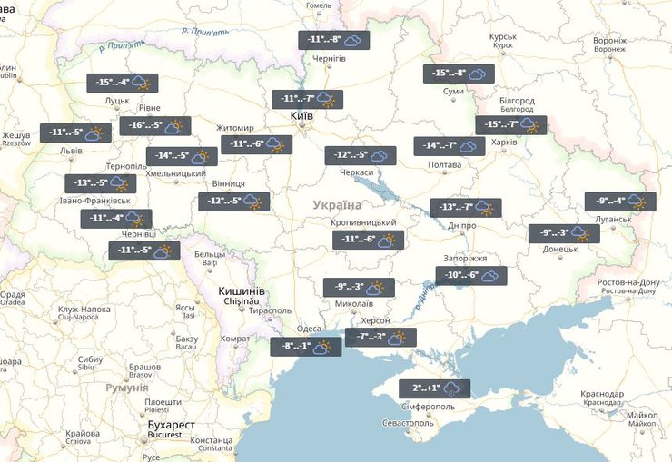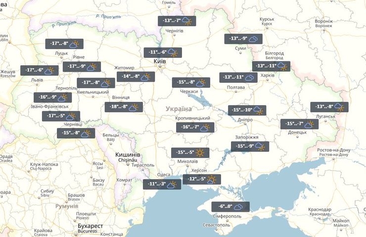 В среду, 18 января, в Украине похолодает, осадки пройдут в Крыму, где днем будет до +1°. Холоднее всего будет на севере, где днем до -8°, в Волынской области ночью до 15 градусов мороза.