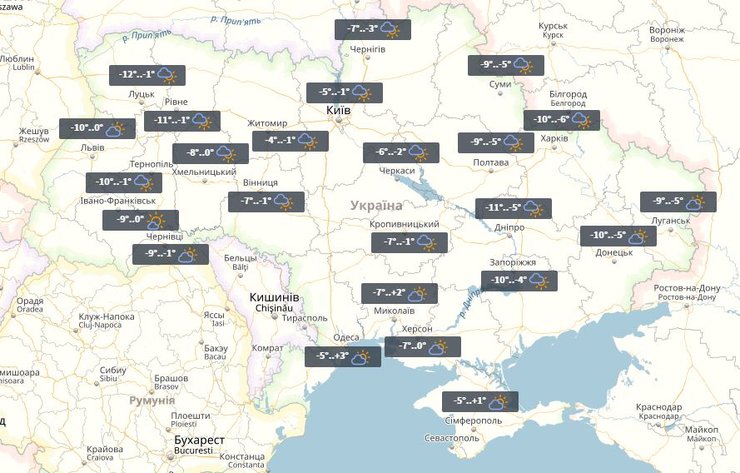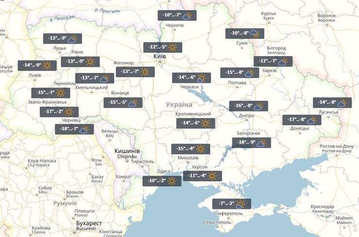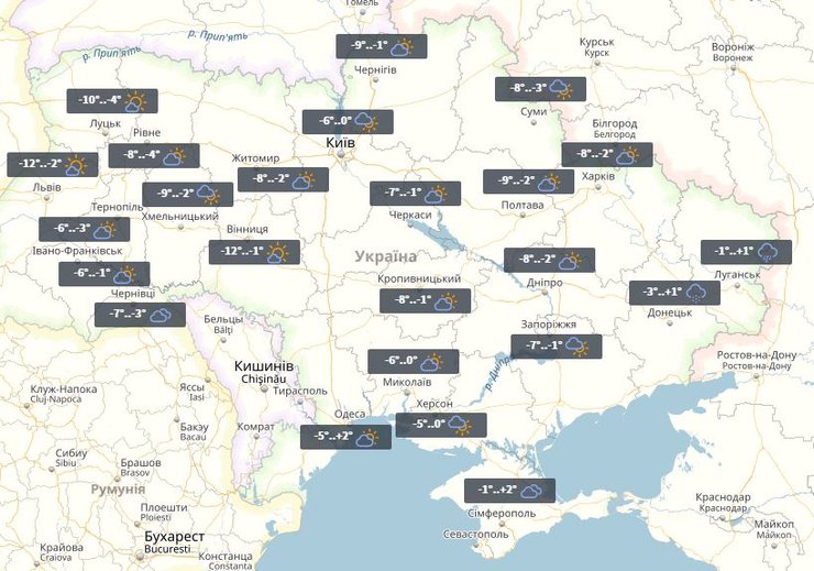 В пятницу обещают ясную погоду, местами облачно с прояснениями, без осадков. В центре и на севере температура -6… -8°, в остальных регионах днем -7°...-9°. В Крыму днем до -2 градусов мороза.