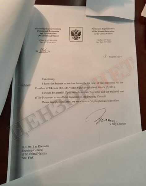 Именно этот документ на заседании СБ ООН 3 марта 2014 года продемонстрировал представитель России Виталий Чуркин.