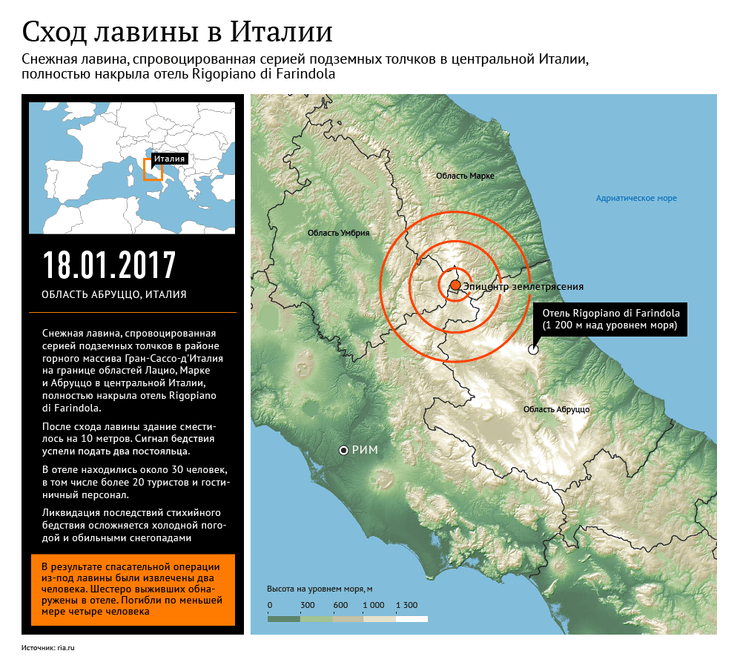 Напомним, в среду в центральной Италии произошли мощные подземные толчки, после этого в горах в регионе Абруццо сошла снежная лавина.
