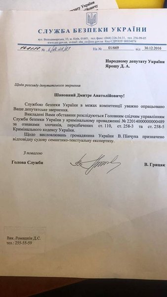 "Относительно высказываний гражданина Украины Пинчука назначена соответствующая судебная семантико-текстуальная экспертиза", – говорится в документе.