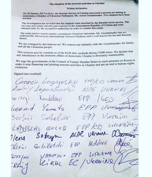 "Парламентская Ассамблея Совета Европы осудила Россию за террористическую деятельность в Украине. Об этом говорится в Декларации ПАСЕ 14257, автором которой я являюсь. Депутаты всех политических групп ПАСЕ, кроме объединенных левых, осудили действия российских спецслужб, направленные на устранение народного депутата Украины Антона Геращенко", – отметил парламентарий.