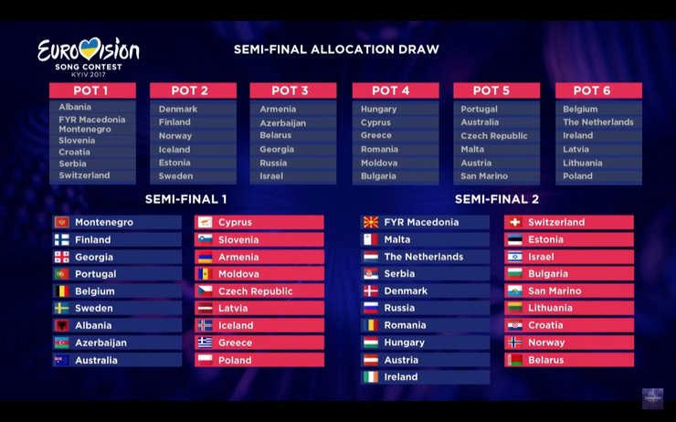 В Киеве провели жеребьевку участников полуфиналов песенного конкурса Евровидение-2017. Результаты представлены на официальном сайте Евровидения.