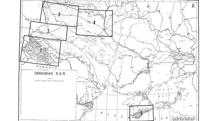 В докладе акцентируется внимание на потенциальном содействии американским спецназовцам со стороны местного населения в антисоветской борьбе. Украина поделена на 12 регионов – от самого слабого до самого сильного антисоветского настроения. Эту карту определяли по таким критериям, как этнический состав регионов, отношение к большевикам в 1917-1921 годах, отношение к немецкой оккупации, размах партизанского движения в годы Второй мировой войны, а также количество случаев вооруженного сопротивления советской власти.