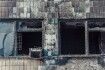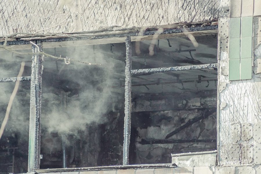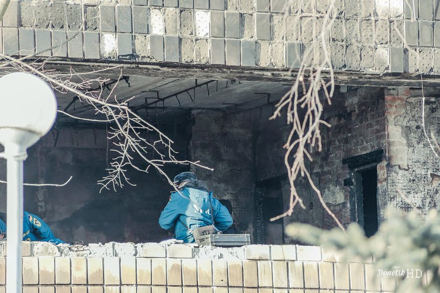На записи видно, что здание сильно повреждено, предположительно, взрывом. Выбиты окна, в некоторых местах вылетели и части стены между ними.