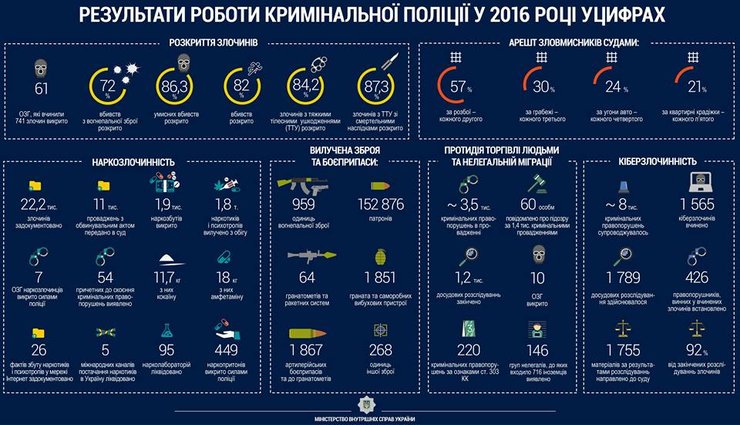 Напомним, ранее начальник Департамента уголовного розыска Национальной полиции Украины Сергей Князев сообщил, что 2016 году совершено 1655 убийств, это на 250 убийств меньше, чем в 2015-м. Из них раскрыто - 1428. Но увеличилось количество убийств, совершенных с использованием огнестрельного оружия и взрывчатки. Так, было совершено 286 убийств с использованием огнестрельного оружия (на 30 убийств больше, чем в 2015 году) и 41 убийство, в котором воспользовались взрывчаткой (в 2015 их было 31).