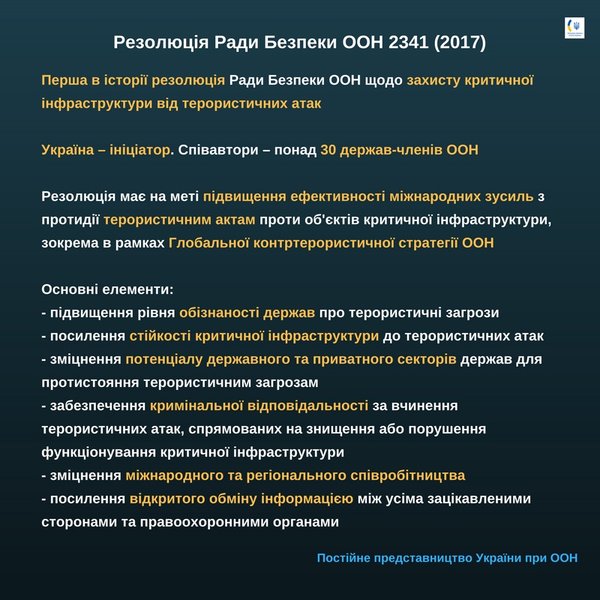"Совбез ООН только что принял резолюцию 2341 о защите критической инфраструктуры от террористических атак, инициированную Украиной", – говорится в сообщении.