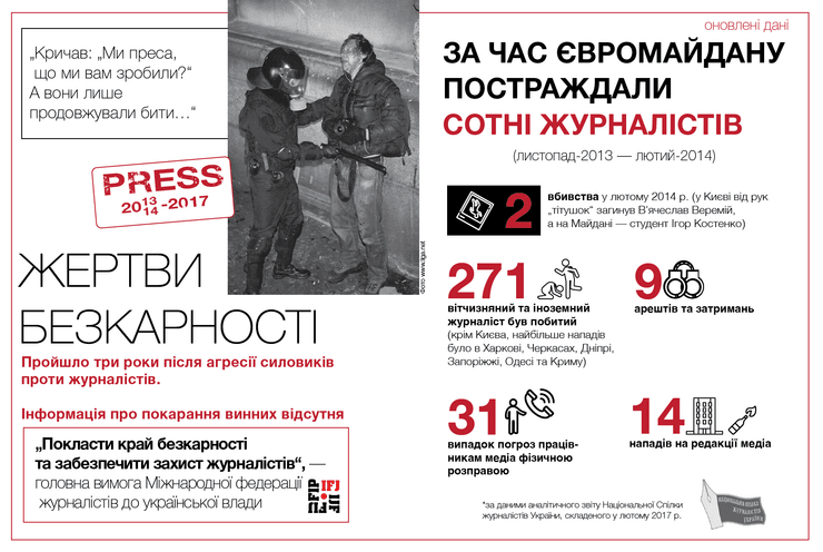 По сводным данным, которые обнародовал Национальный союз журналистов Украины на сегодняшней пресс-конференци, 271 отечественный и иностранный журналист был избит. Кроме Киева, больше всего нападений было в Харькове, Черкассах, Днепре, Запорожье, Одессе и Крыму. Также зафиксировано девять арестов и задержаний работников СМИ, 14 нападений на редакции СМИ, 31 случай угроз работникам СМИ физической расправой.