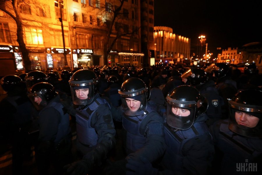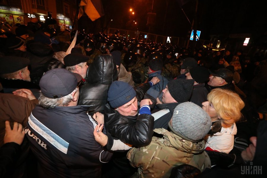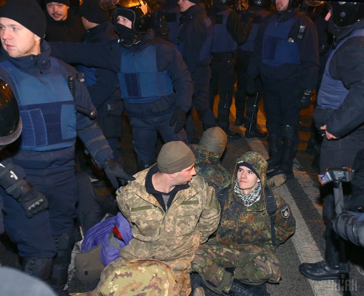 В воскресенье, 19 февраля, в центре Киева во время акций протеста произошли столкновения между членами добровольческого движения "Организация украинских националистов", а также сторонниками торговой блокады оккупированных районов Донбасса - с одной стороны, и полицейскими – с другой.