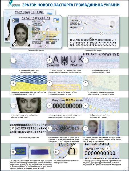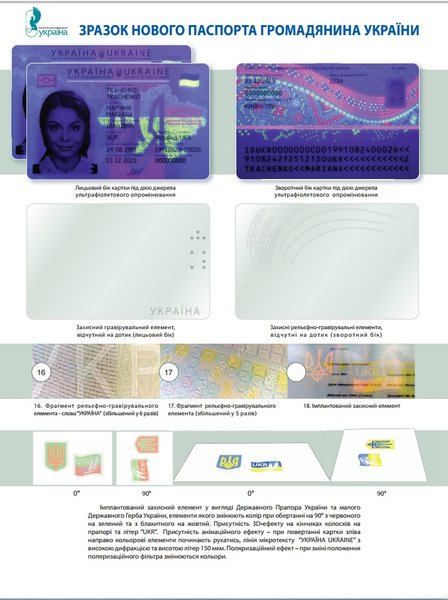 Государственная миграционная служба обнародовала информацию о внешнем виде нового паспорта гражданина Украины (ID-карточки) с обозначением защитных зон и элементов защиты, а также об изменениях в законодательстве относительно новых паспортов.