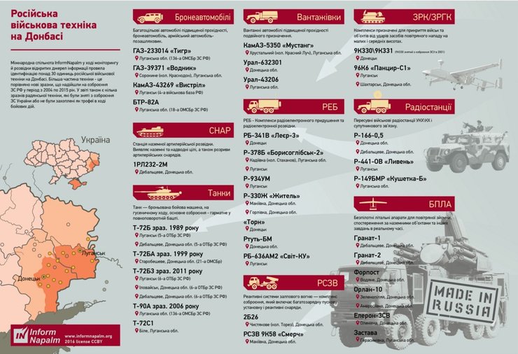 Отмечается, что эти данные подкреплены детализированными OSINT-расследованиями InformNapalm, с фото- и видеоматериалами, это доказывает, что РФ систематически обеспечивала и продолжает обеспечивать террористов и своих военнослужащих в Донбассе современной военной техникой.
