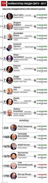Список десяти самых богатых толстосумов и позиции украинцев в рейтинге богачей смотрите в инфографике ТСН.