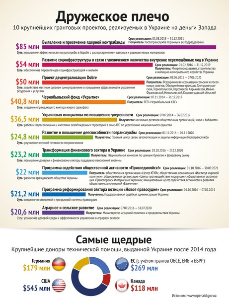 Крупнейший иностранный донор и кредитор Украины — Европейский союз. За три года после победы Революции достоинства на нужды нашей страны ЕС обязался выделить 12,8 млрд евро. Львиную их долю составляют кредиты, но почти 800 млн евро отдано безвозмездно в виде грантов.