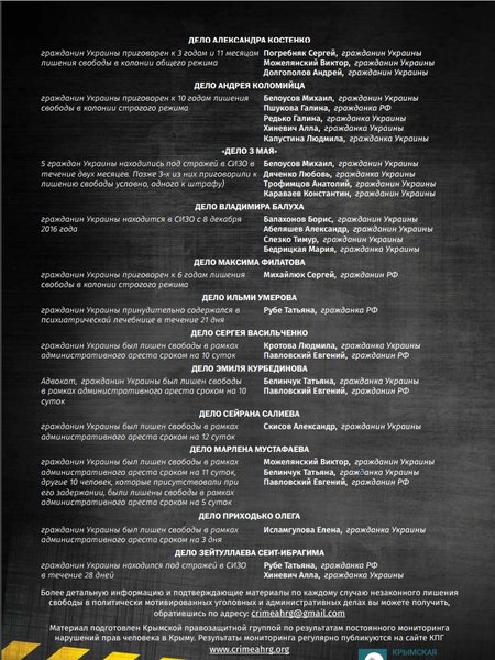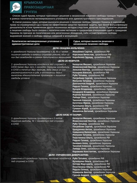 "Крымская правозащитная группа собрала информацию о судьях, которые принимают участие в грубейших нарушениях прав человека в Крыму. В список вошли судьи, которые принимали решения в делах узников Кремля. В списке судей – граждане и России, и Украины. Примечательно, что некоторые судьи принимали и продолжают принимать решения сразу по нескольким делам политзаключенных украинцев", – сказано в сообщении.