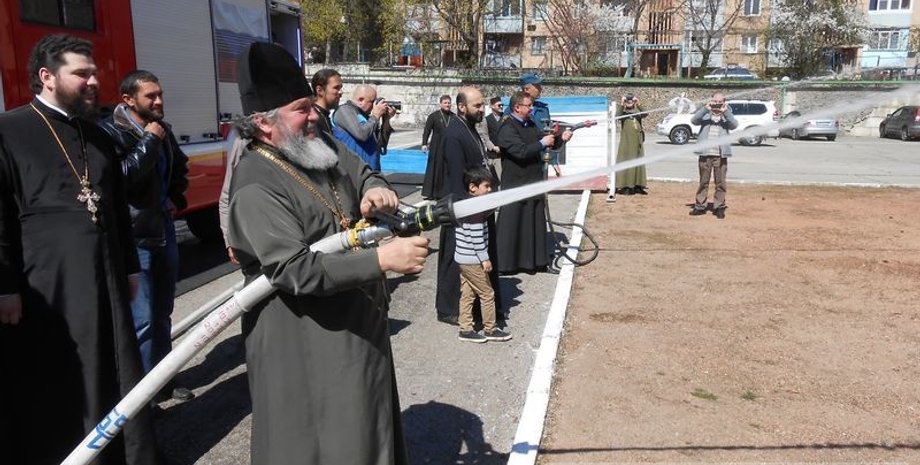 Сотрудники МЧС оккупированного Крыма продемонстрировали местным священнослужителям пожарное оборудование и экипировку.