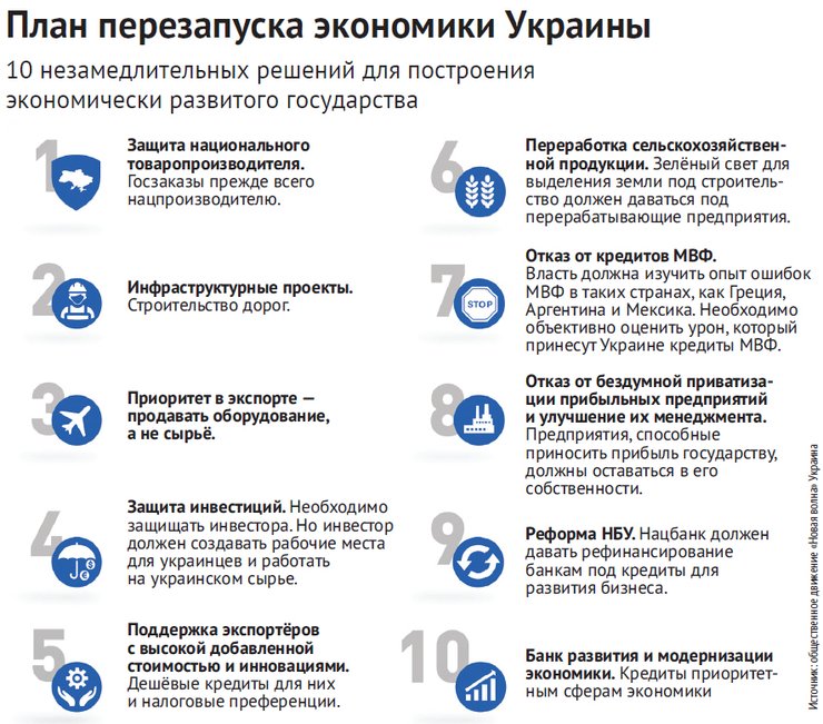 — Мы должны использовать тот огромный потенциал, который у нас еще остался. Украина должна выдвинуть МВФ ультиматум, предусматривающий экстренный перезапуск экономики страны. Это понятные действия, которые должны лечь в основу ультиматума фонду уже сегодня. Это поддержка национального производителя; это приоритет в госзаказах для украинских, а не зарубежных предприятий; преференции производителям товаров с высокой добавленной стоимостью; реализация инфраструктурных проектов.