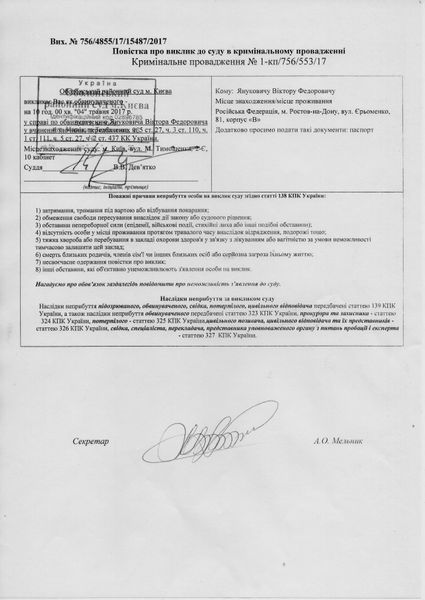 Оболонский районный суд вызывает беглого экс-президента Виктора Януковича на заседание по делу о госизмене, которое состоится 4 мая. Соответствующая повестка опубликована на сайте "Судебная власть Украины".
