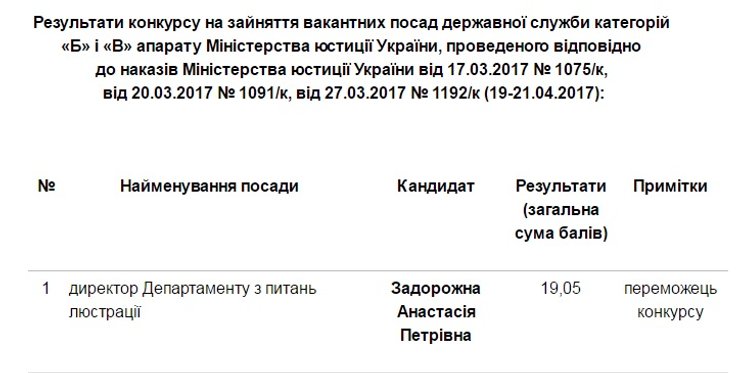 Напомним, до этого момента Анастасия Задорожная исполняла обязанности директора люстрационного департамента. Она работает в отделе правового обеспечения и научно-аналитической работы данного департамента.