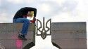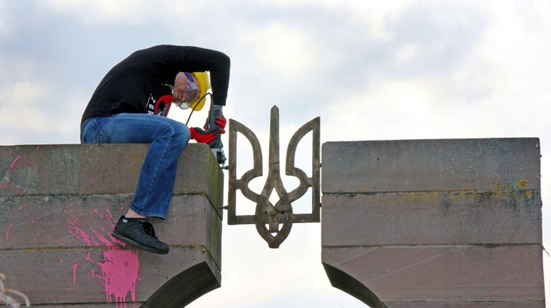 На фотографиях видно, как мужчины в черных футболках с изображенной на них "антибандеровской" символикой сняли с монумента металлический трезубец, а сам памятник разобрали на части.