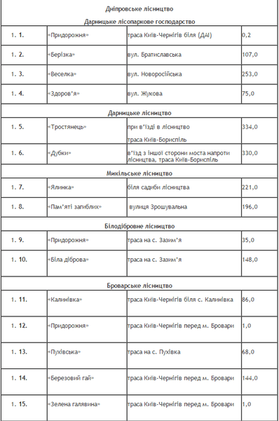 Приводим перечень зон отдыха на территории лесопарковых хозяйств, входящих в состав "Киевзеленстроя".