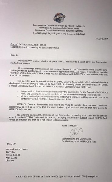 "Комиссия по контролю за файлами Интерпола на 99 сессии приняла решение о прекращении розыска Эдуарда Ставицкого. Сегодня получено официальное подтверждение из Интерпола и от Комиссии по контролю за файлами Интерпола, что жалоба Эдуарда Ставицкого полностью удовлетворена, его уголовное преследование признано политическим. Комиссия приняла во внимание наши аргументы", - сообщил Иващенко.