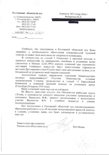 В ответе суд ссылается на 5 статью Конвенции о правовой помощи и правовых отношениях по гражданским, семейным и уголовным делам. Исходя из статьи, запрашиваемая сторона (Оболонский районный суд Киева, в производстве которого находится дело Януковича, - ред.) не отправила официальное обращение о предоставлении международной правовой помощи.