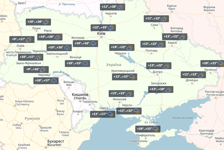 В четверг в Украине пройдут дожди. Ночью по стране +7°...+13°, днем на востоке до +22°.