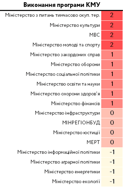 Только четыре министерства смогли выполнить программу КМУ более чем на 80%. Министерство культуры выполнило программу КМУ на 100%, хотя за год количество задач этого министерства сократилось вдвое. В начальной версии было запланировано 10 задач, но в последней осталось только 5. То есть могло бы быть выполнение программы только на 50%, но так как анализировалась последняя редакция программы КМУ, министерству было засчитано 100%-е выполнение.