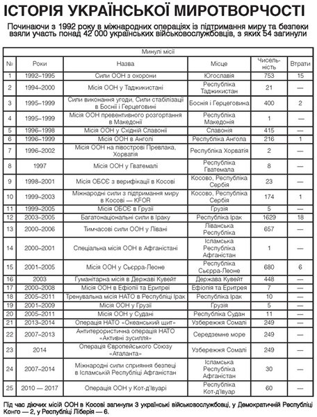 Всего с 1992 года в международных операциях приняли участие 42 тыс. миротворцев из Украины, 54 человека погибли в миссиях.
