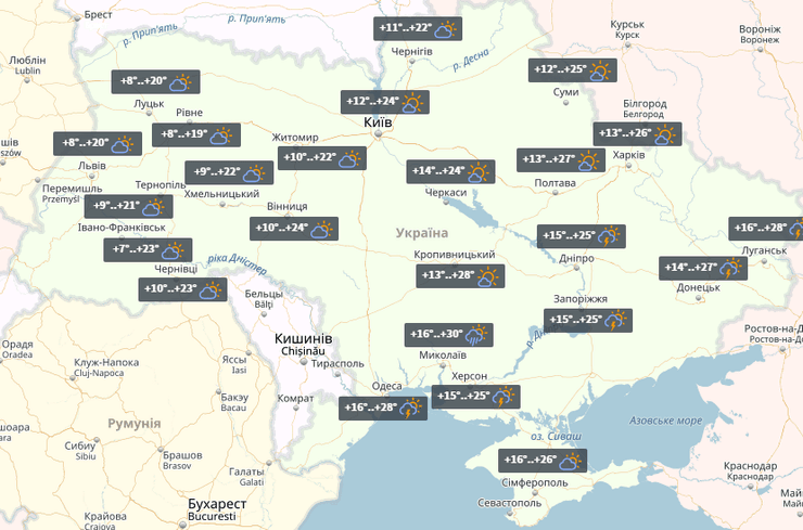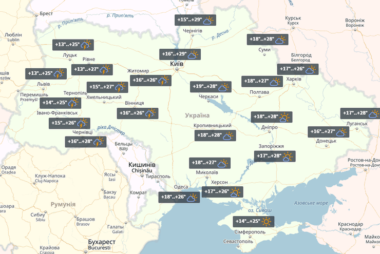 В четверг в Украине местами пройдут дожди. Ночью по стране +8°...+16°, днем на юге до +29°.