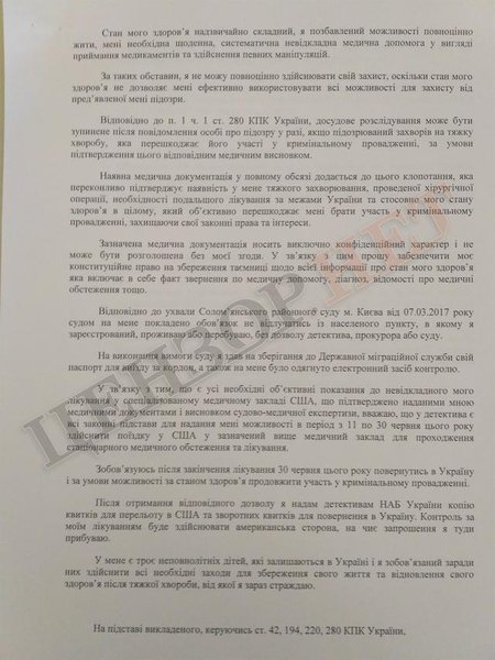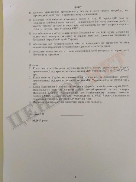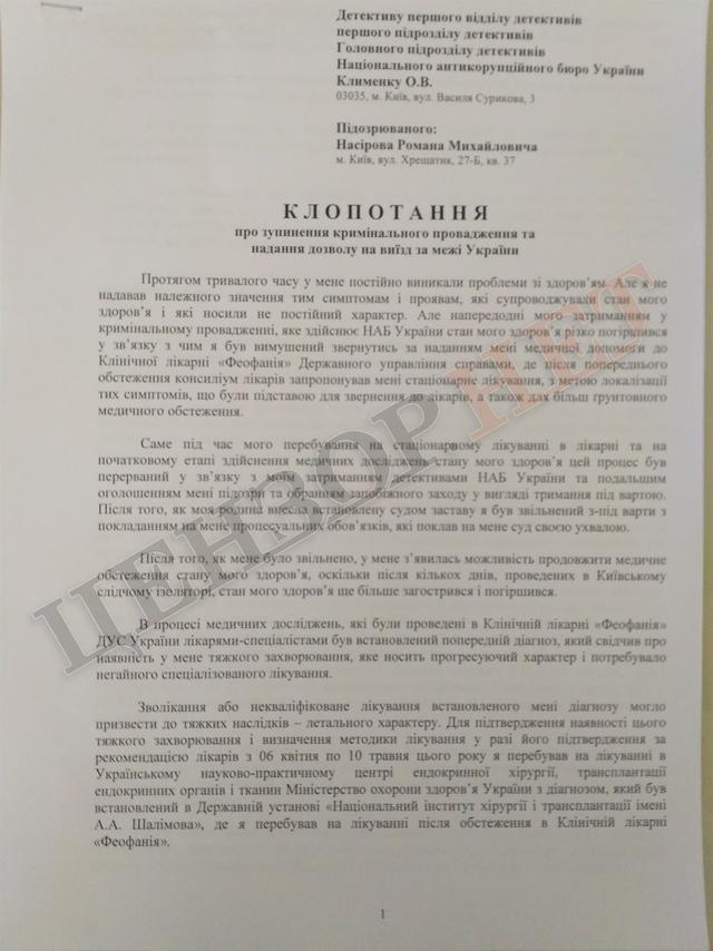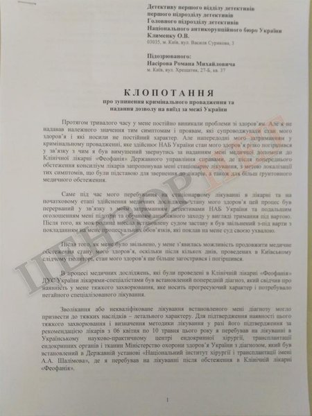 В распоряжении журналистов оказалось поданное в НАБУ прошение Романа Насирова и заключение судебно-медицинской экспертизы относительно состояния его здоровья.
