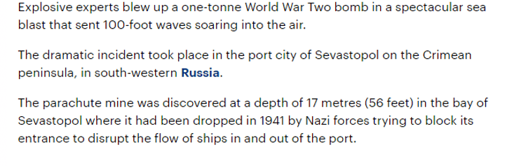 Сообщается, что бомба была обнаружена на глубине 17 метров в бухте Севастополя, куда она была сброшена в 1941 году. Бомба была отбуксирована в открытое море, где специалисты взорвали ее.