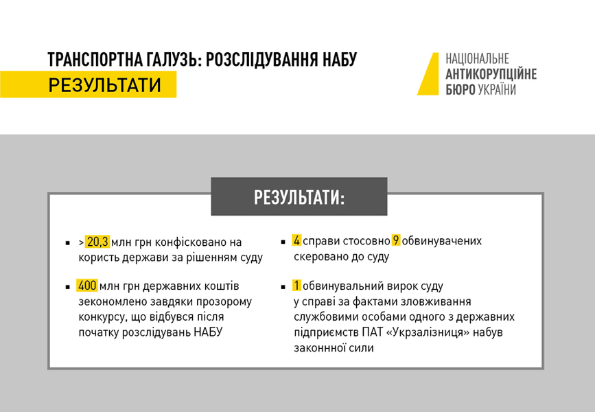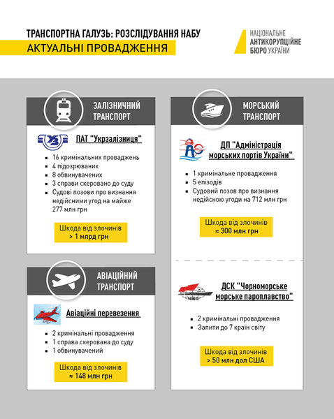 В общем, детективы НАБУ под процессуальным руководством прокуроров Специализированной антикоррупционной прокуратуры расследуют коррупционные преступления в транспортной отрасли в рамках более 20 уголовных производств. Досудебное расследование по четырем из них завершено. Обвинительные акты в отношении девяти лиц направлены в суд.
