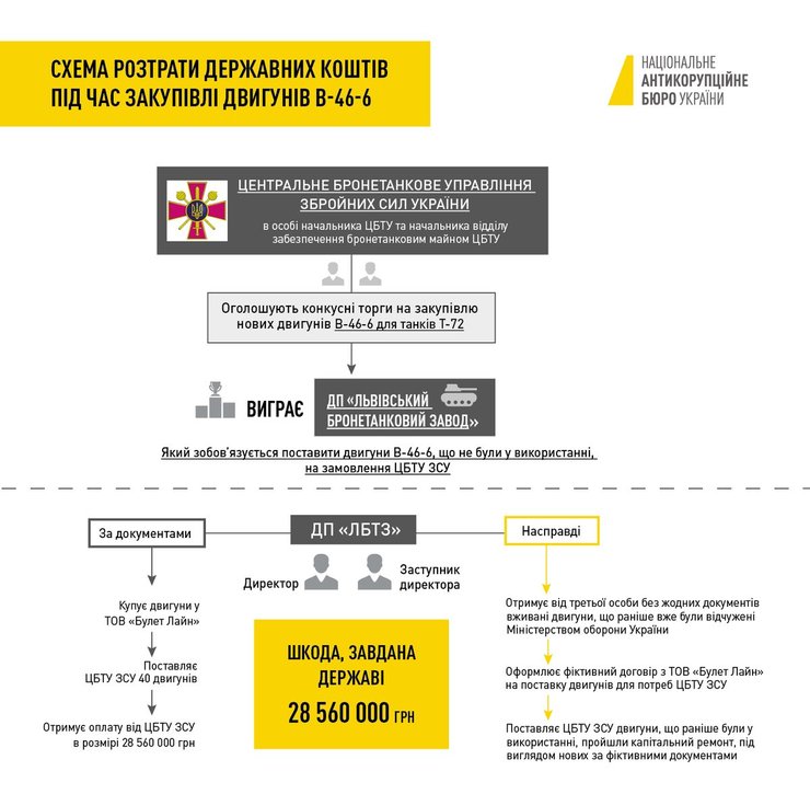 Согласно схеме, Львовский бронетанковый завод выиграл тендер Центрального бронетанкового управления вооруженных сил Украины на закупку двигателей для танков. По документам, завод закупил у компании "Булет Лайн" 40 двигателей В-46-6 и поставил их в Центральное бронетанковое управление ВСУ, за что получил 28 млн 560 тыс. грн.