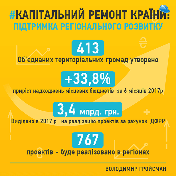Гройсман добавил, что кроме средств в местных бюджетах, которые каждая община распределяет по своему усмотрению, правительство финансирует ряд проектов Государственного Фонда регионального развития. В этом году было выделено 3,4 млрд грн на реализацию 767 проектов.