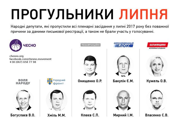 В июле 2017 года восемь народных депутатов пропустили все заседания Верховной Рады Украины. Об этом говорится в сообщении общественного движения "ЧЕСТНО".