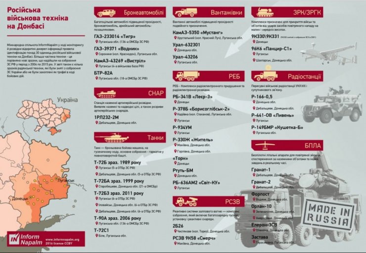 Международная группа расследователей InformNapalm идентифицировала уже 44 типа вооружения и спецтехники страны агрессора на востоке Украины.