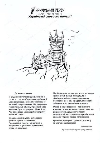 В окуппированом Крыму Украинский культурный центр представил первый экспериментальный выпуск издания "Крымский Терен" на украинском и русском языках.