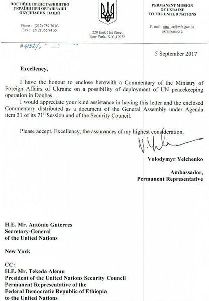 Украина передала генсеку и в Совбез ООН позицию по миротворческой миссии в Донбассе
