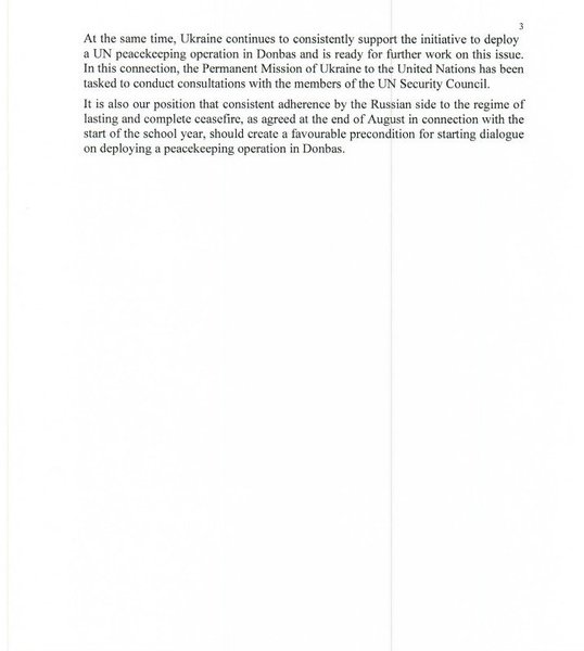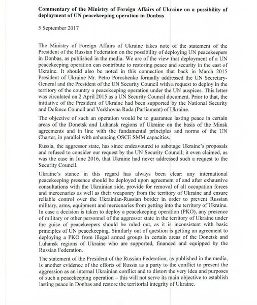 Согласно документу, Украина выступает категорически против присутствия в контингенте миротворцев от Российской Федерации (РФ), поскольку РФ является страной-агрессором в конфликте в Донбассе.