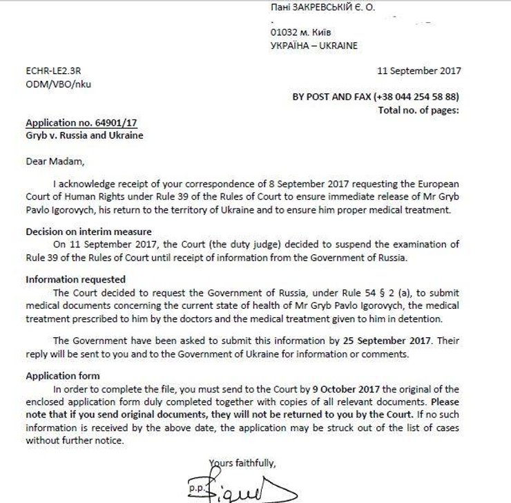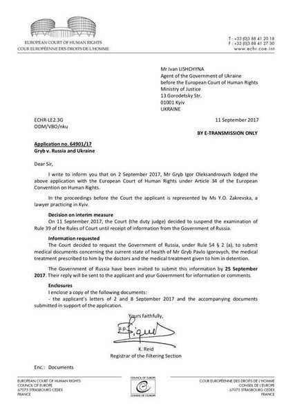 Как отметила адвокат Евгения Закревская на своей странице в Facebook, ЕСПЧ таким образом отреагировал на ее заявление и попросил правительство РФ до 25 сентября предоставить медицинскую документацию о состоянии здоровья Гриба, а также указать, какие лекарства ему прописаны, и какие он получает.