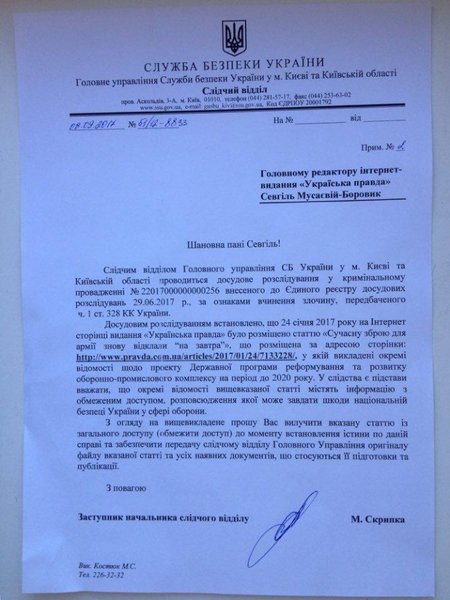 "Учитывая вышеизложенное, прошу Вас удалить указанную страницу из общего доступа (ограничить доступ) до момента установления истины по данному делу и обеспечить передачу следственному отделу Главного Управления оригинала файла указанной статьи и всех имеющихся документов, касающихся ее подготовки и публикации", – говорится в письме СБУ.