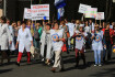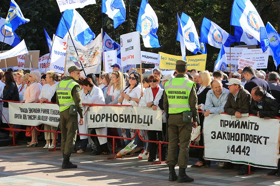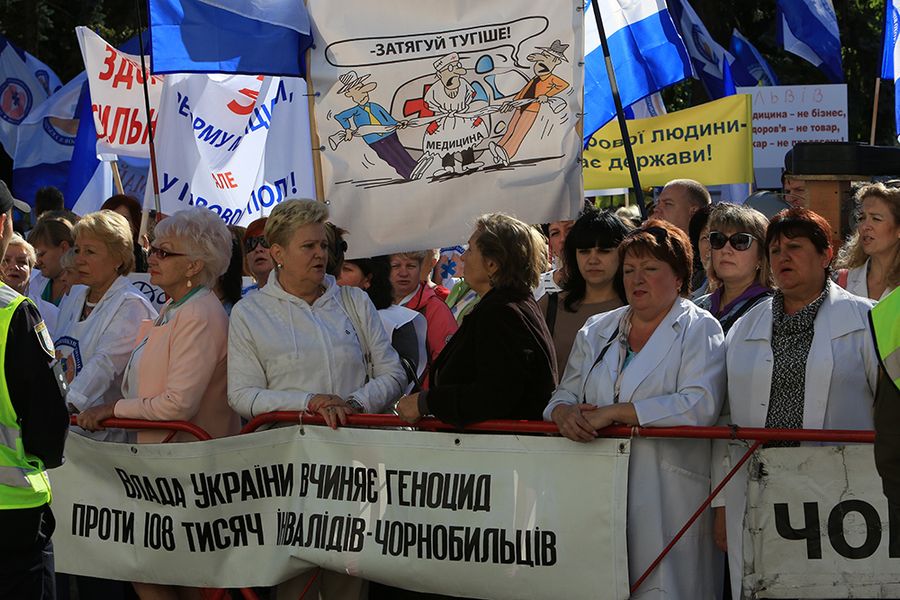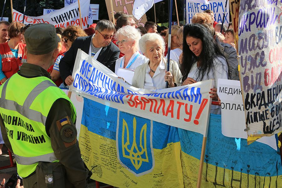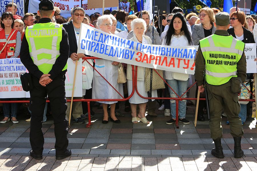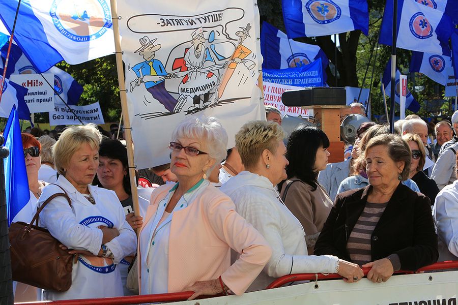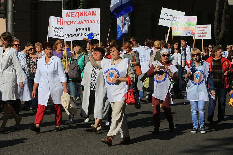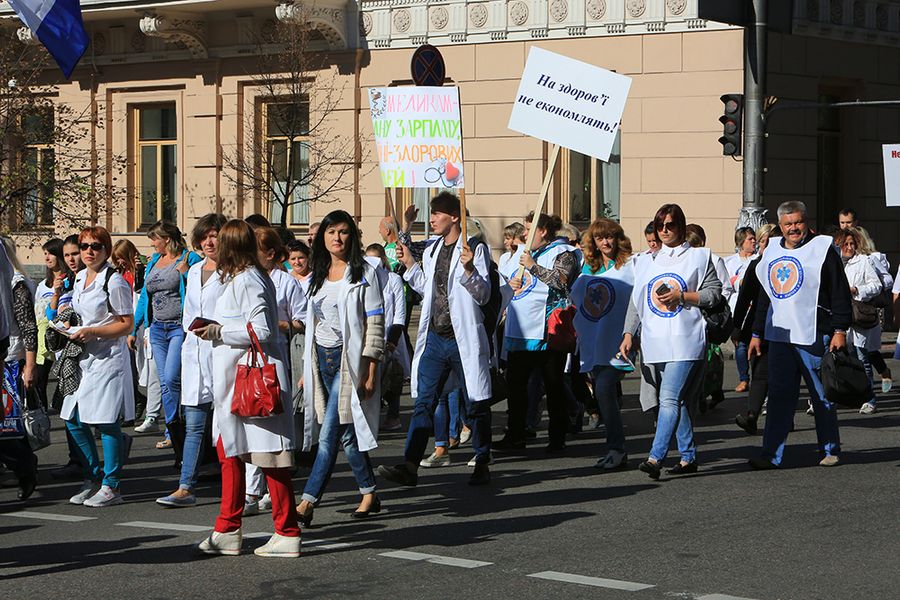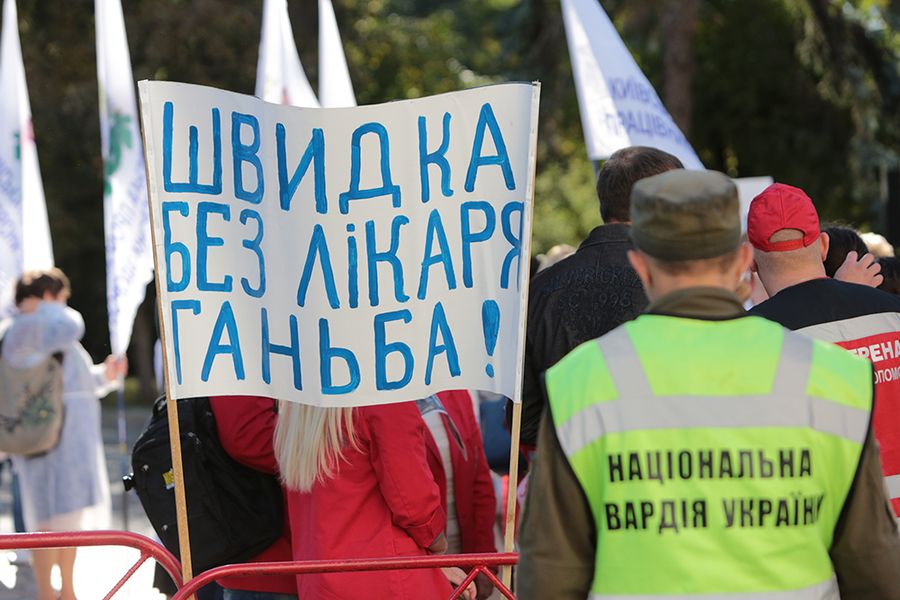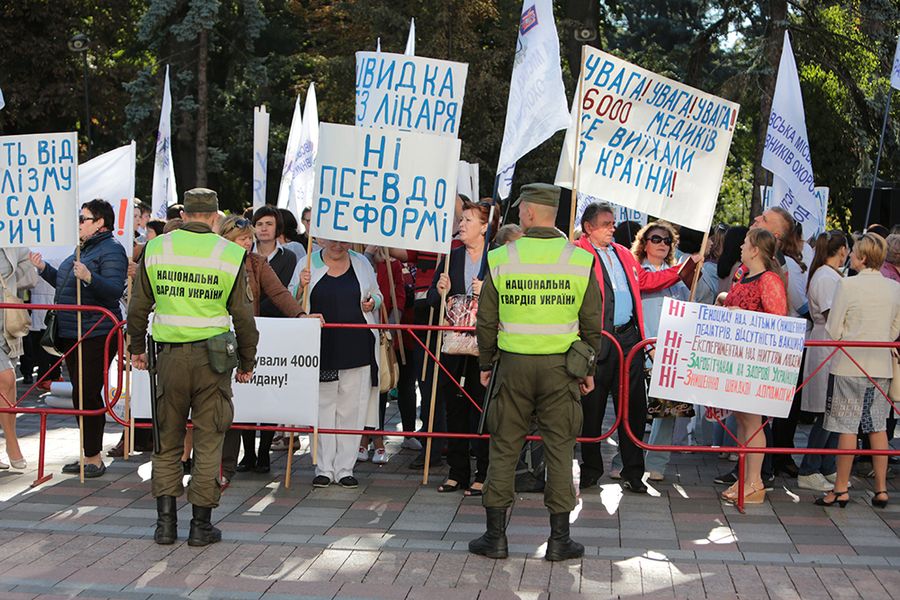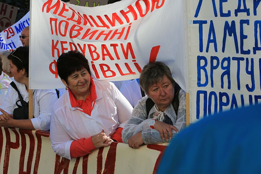 Один из главных оппонентов медреформы, глава профильного комитета ВР Рады Ольга Богомолец, с утра предупреждала, что с целью дискредитации медиков руководство Минздрава привезет на их акцию множество бомжей. Но последних под Радой заметно не было.