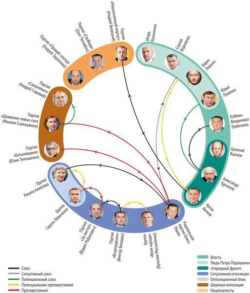 Фокус представляет схематическую расстановку основных игроков на политическом поле. При этом важно понимать, что никакая схема не может отобразить всю сложность отношений между украинскими политиками и их партиями. К примеру, тот же Олег Ляшко, несмотря на всю критику власти, успешно играет ей на руку, критикуя Юлию Тимошенко. А "Народный фронт" — это не единое целое, а зонтичное объединение ряда политиков, которых связывают не союзнические обязательства, а скорее пакт о ненападении. Тот же Арсен Аваков давным-давно играет собственную политическую игру. Как, впрочем, и Владимир Гройсман, Юрий Луценко, Александр Турчинов, Арсений Яценюк, постоянно ведущие переговоры друг с другом все вместе, и друг у друга за спиной. К тому же в украинской политике нет ничего постоянного, так что в ближайшие месяцы мы наверняка увидим немало удивительных союзов и противостояний.