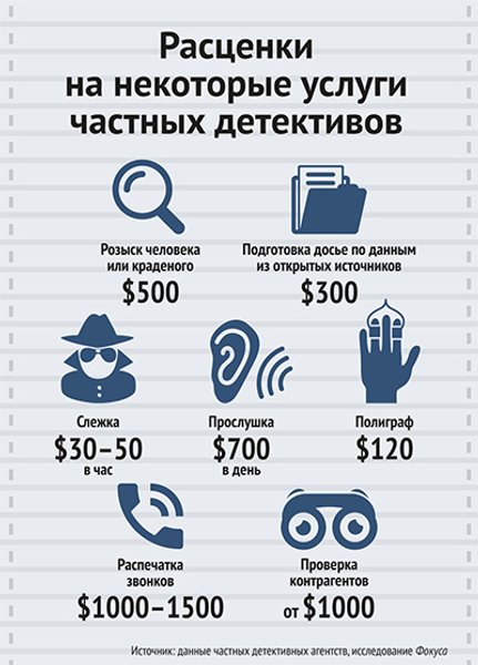 Одна из самых востребованных услуг — наружное наблюдение. Ее заказ не вызывает затруднений. "Выделяем экипаж (машина и два человека), наблюдение ведем до двери, — заявили Фокусу в одном из столичных детективных агентств. — Только в суде эти данные использовать не получится, разве что кто-то из ваших знакомых заявит, что сам видел и снял". За слежку частные детективы требуют порядка $30–50 в час.